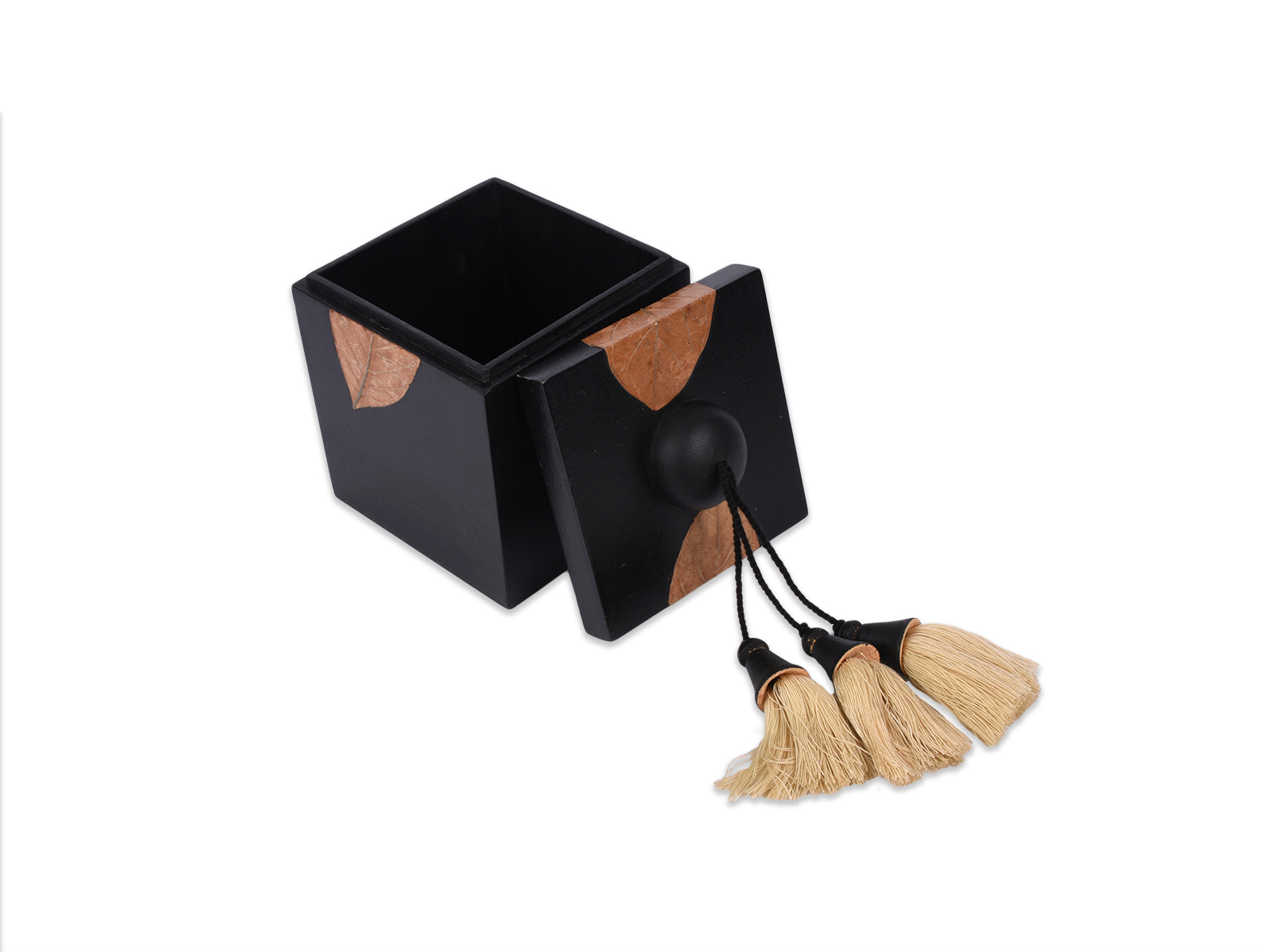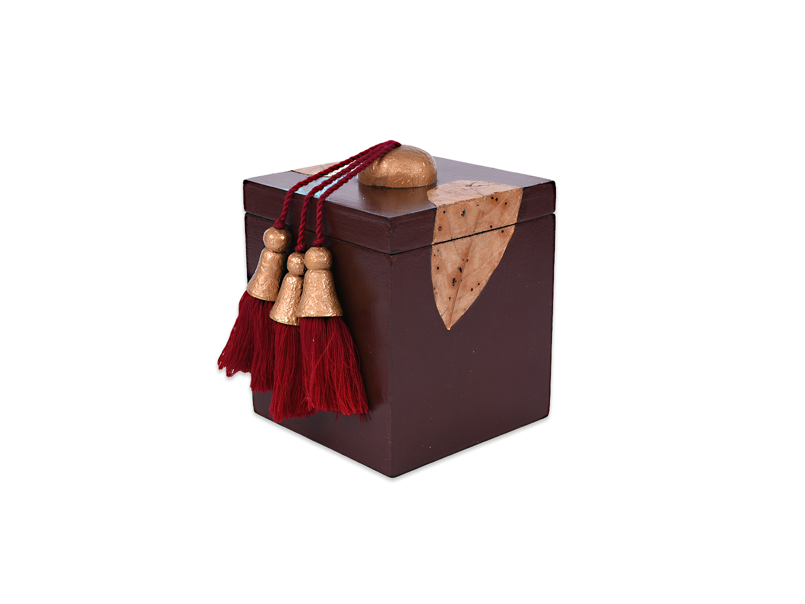 Κουτί διακοσμητικό με χρυσά φύλλα και φούντες στο καπάκι.