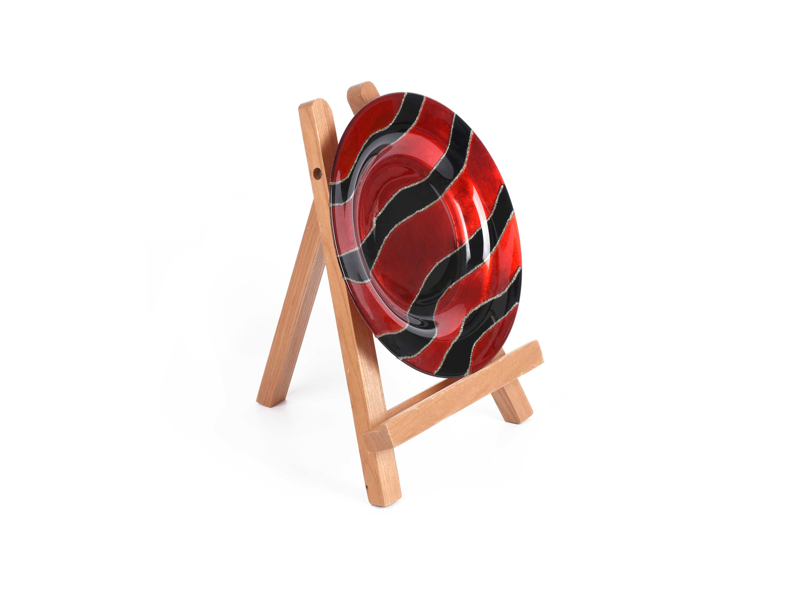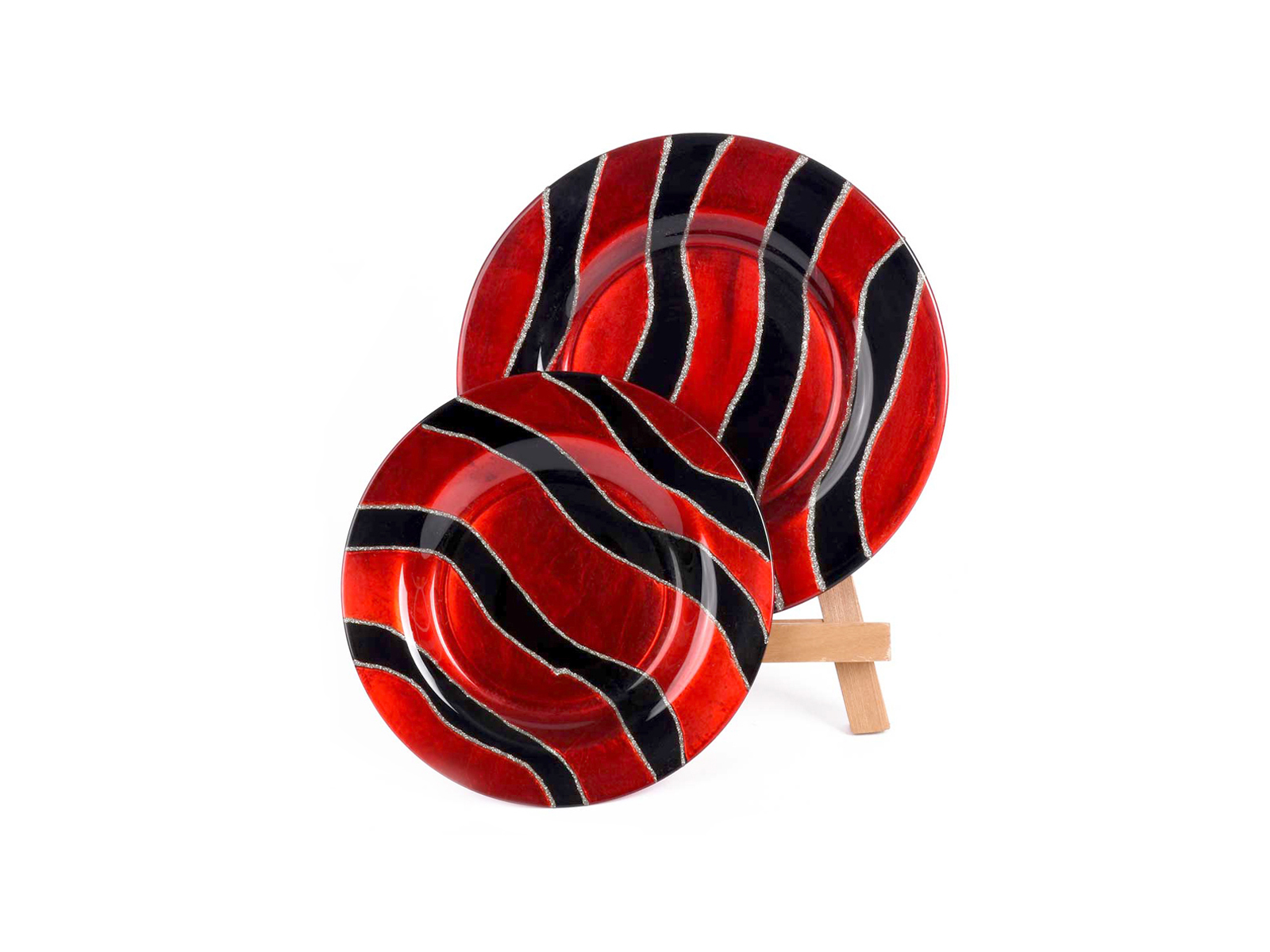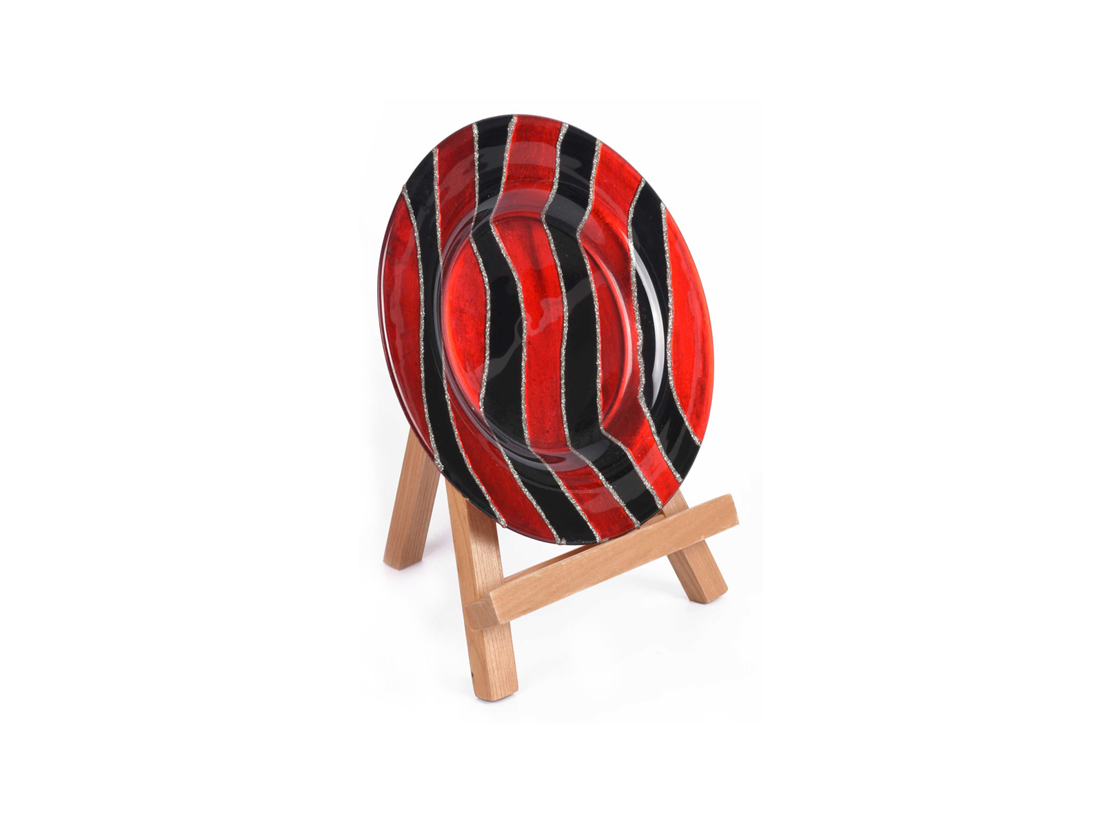 Διακοσμητικό πιάτο από γυαλί, ριγέ σε κόκκινο και μαύρο χρώμα με ασημί λεπτομέρειες.