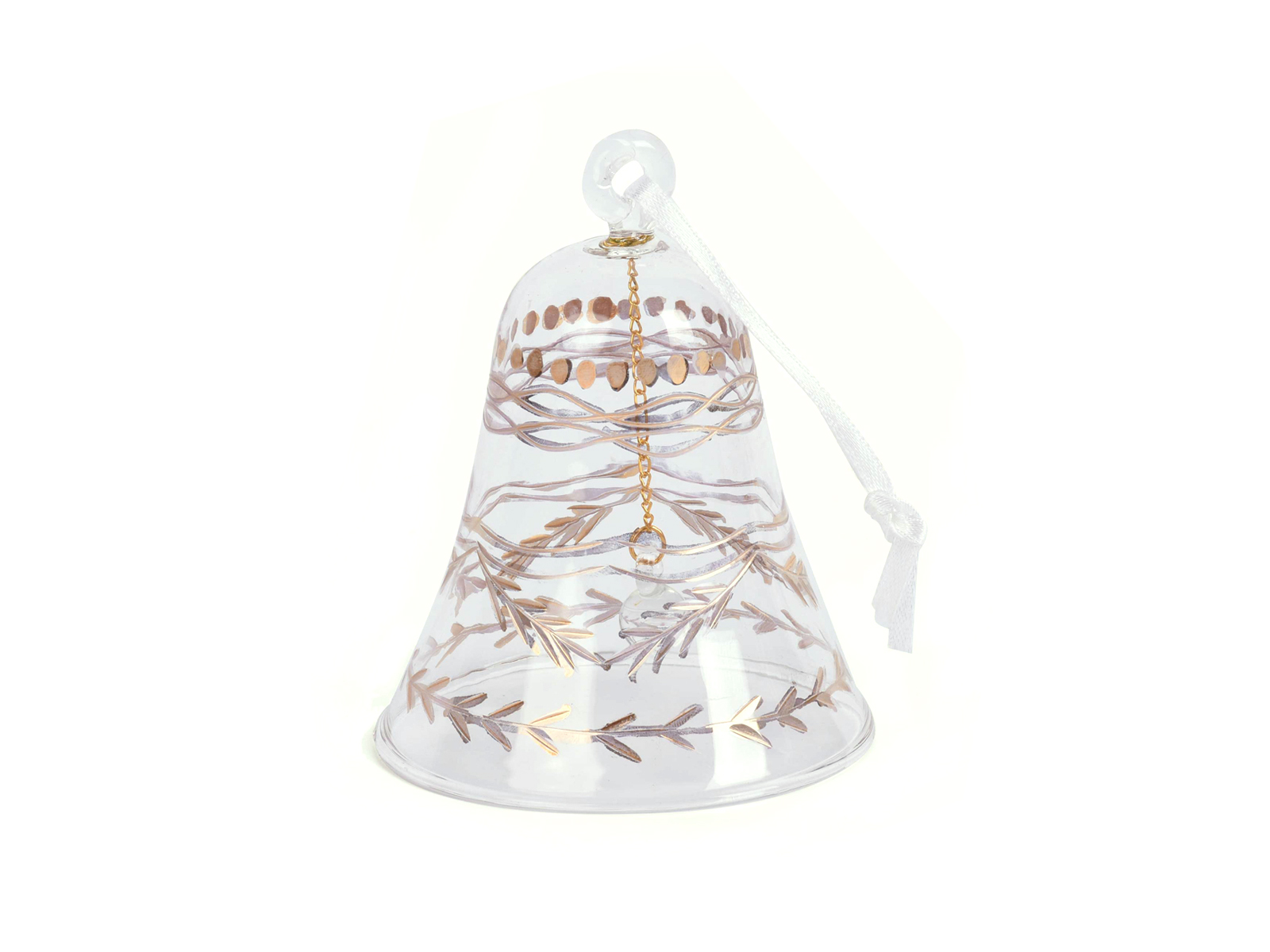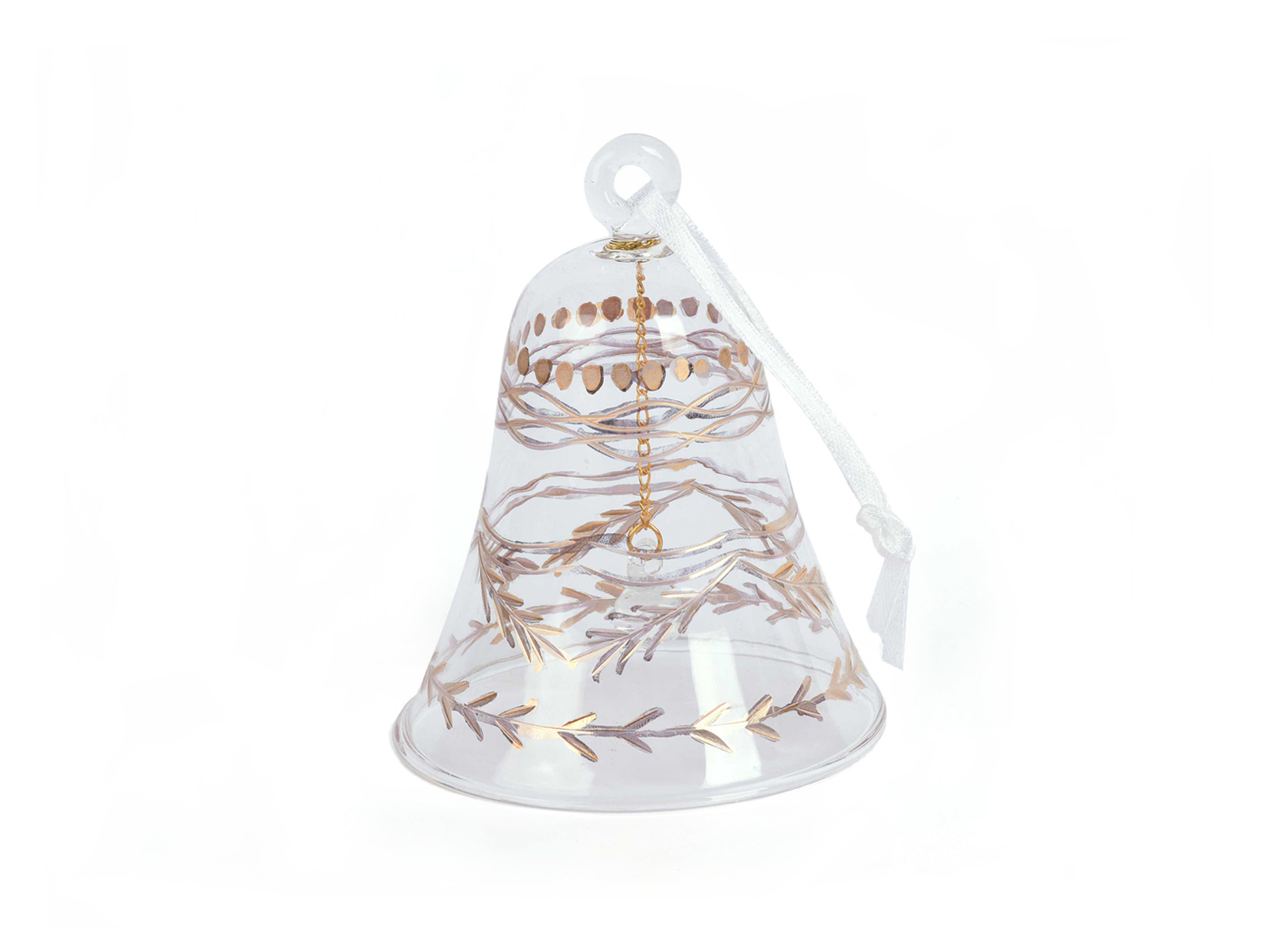 Διακοσμητικό στολίδι σε σχήμα καμπάνας από γυαλί, διάφανο με χρυσές λεπτομέριες.