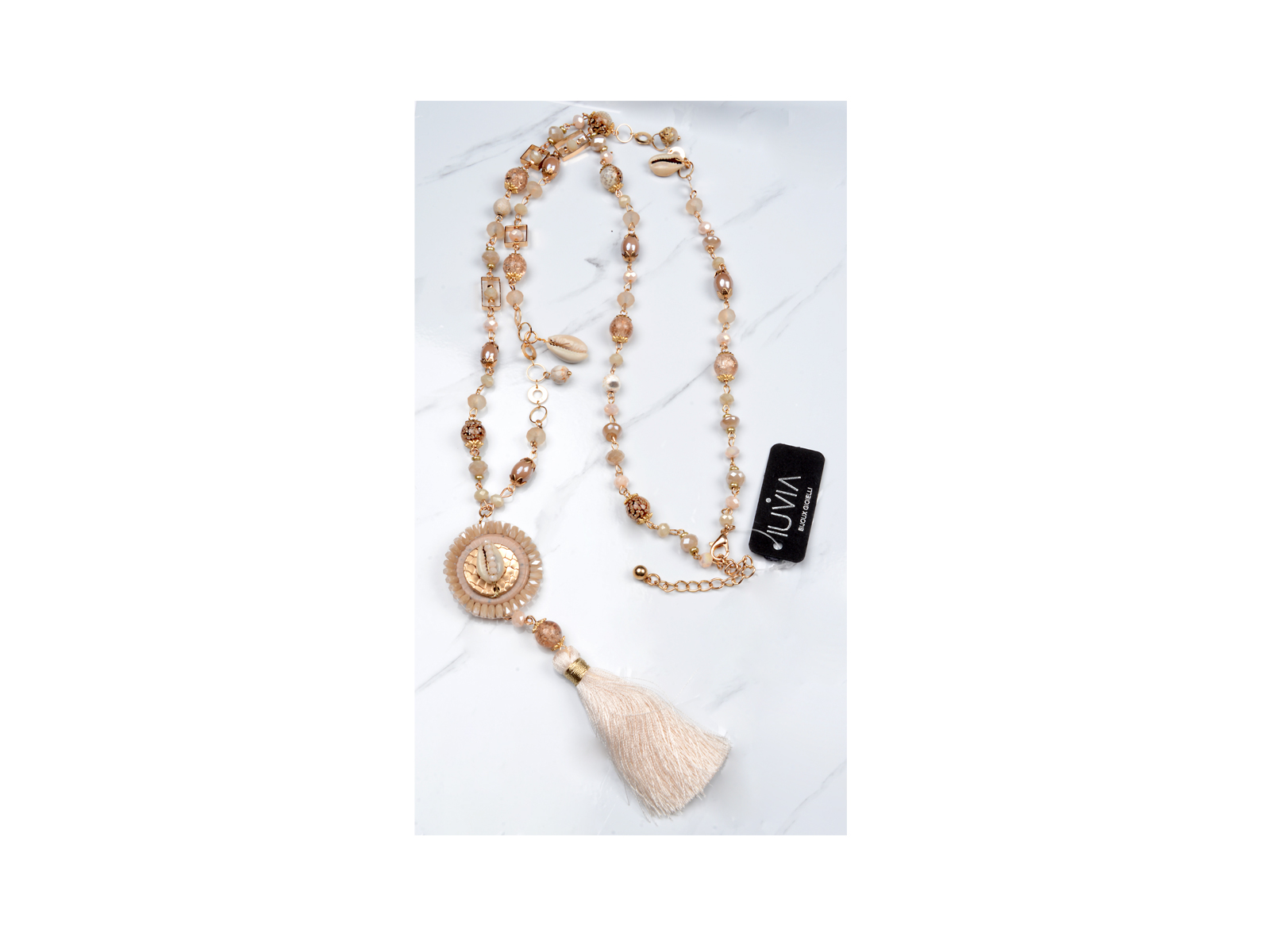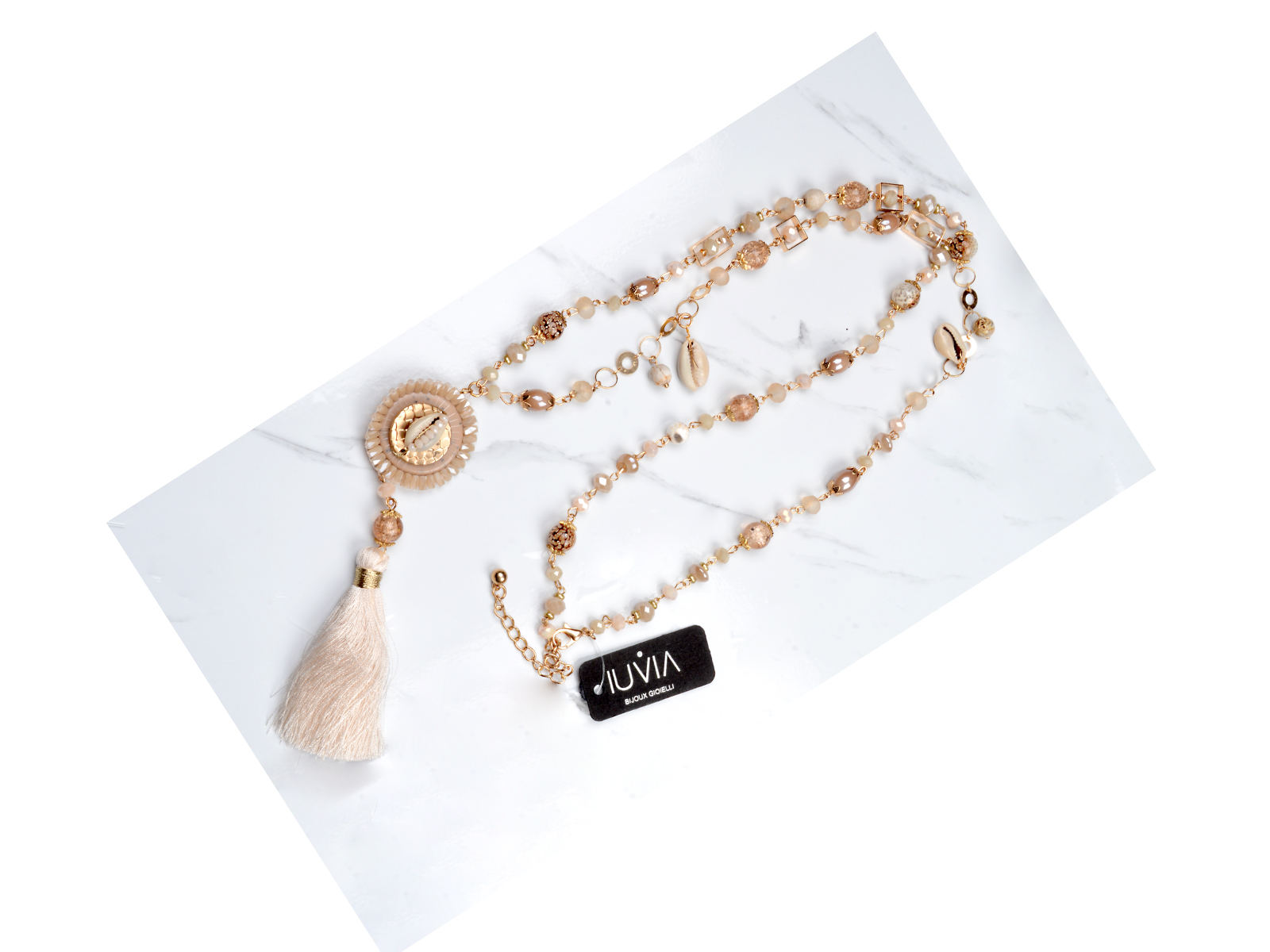 Καλοκαιρινό κολιέ με χάντρες, κοχύλια και λευκή φούντα.