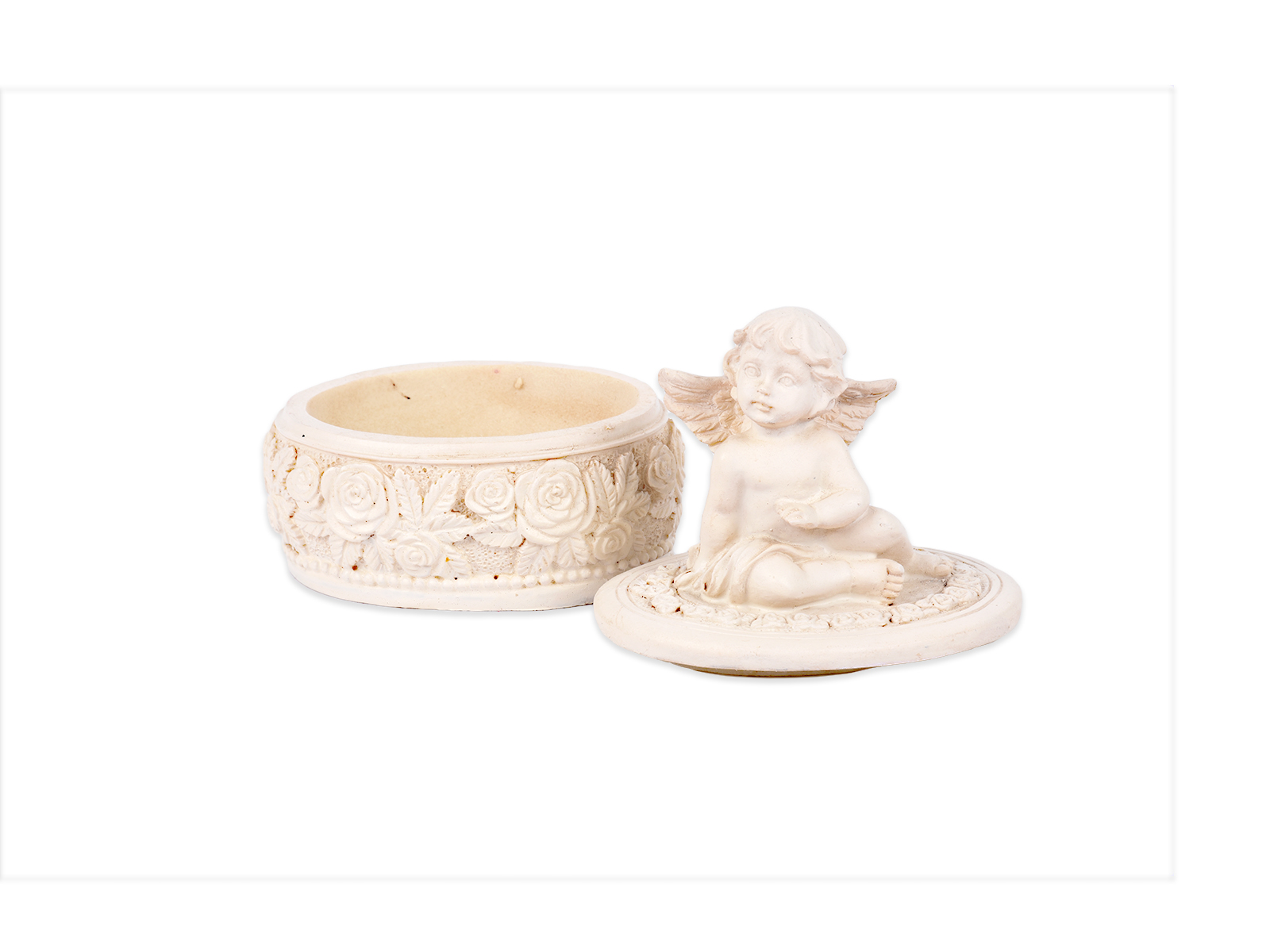 Διακοσμητικό κουτί σχήματος οβάλ με αγγελάκι στο καπάκι από γύψο.