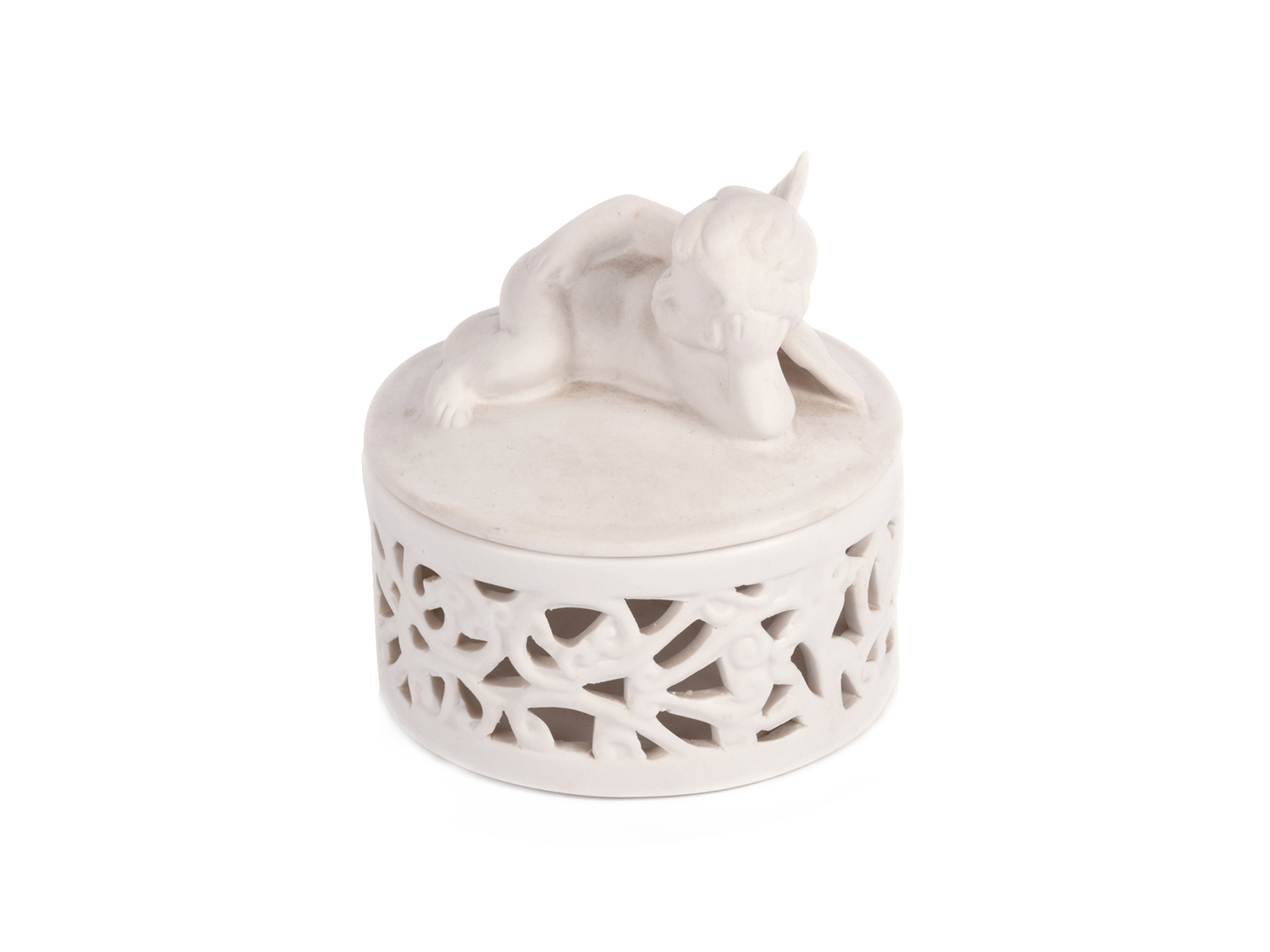 Διακοσμητικό κουτί στρογγυλού σχήματος με αγγελάκι στο καπάκι από γύψο.
