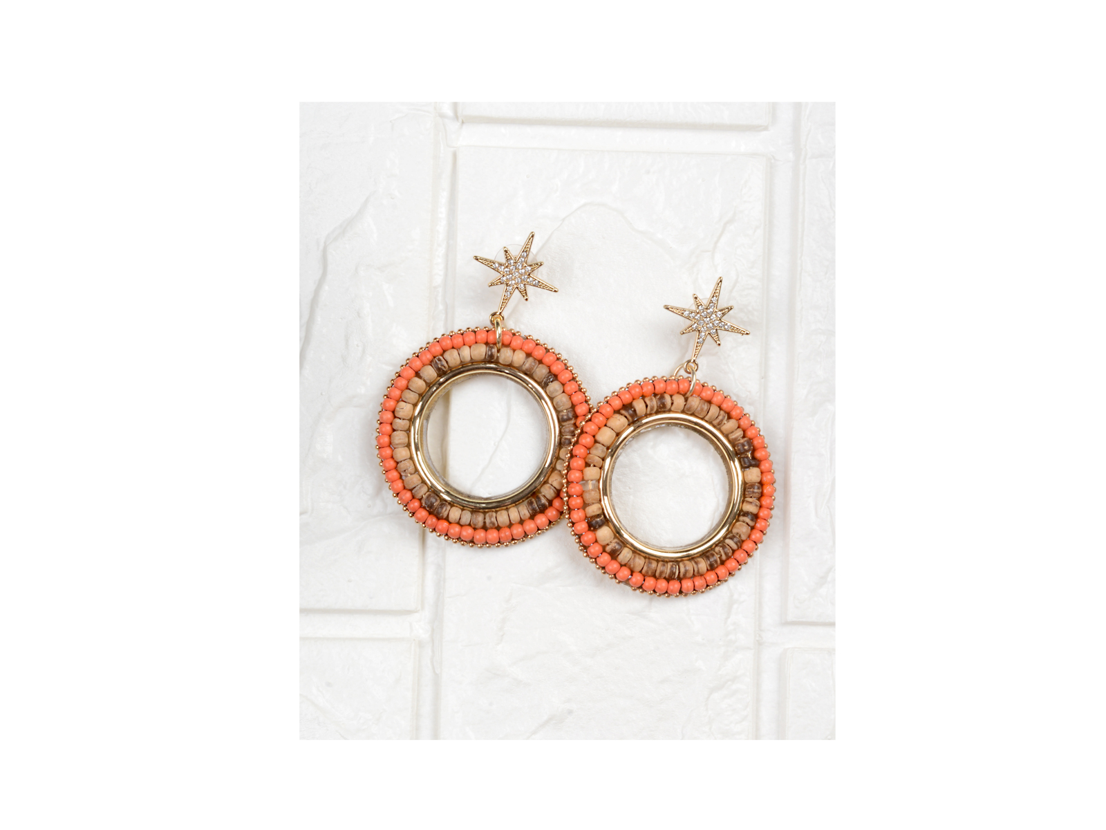 Κρεμαστά σκουλαρίκια κύκλος με πορτοκαλί χάντρες και αστεράκια.