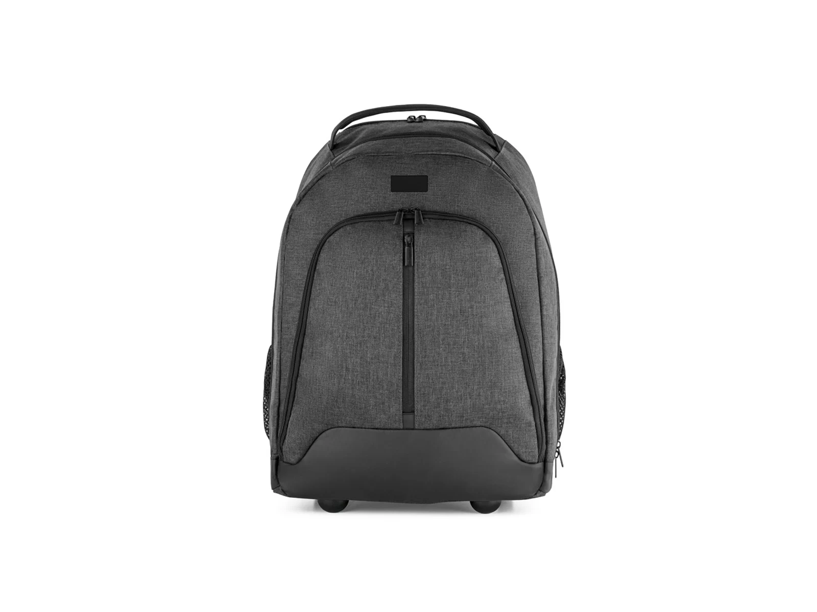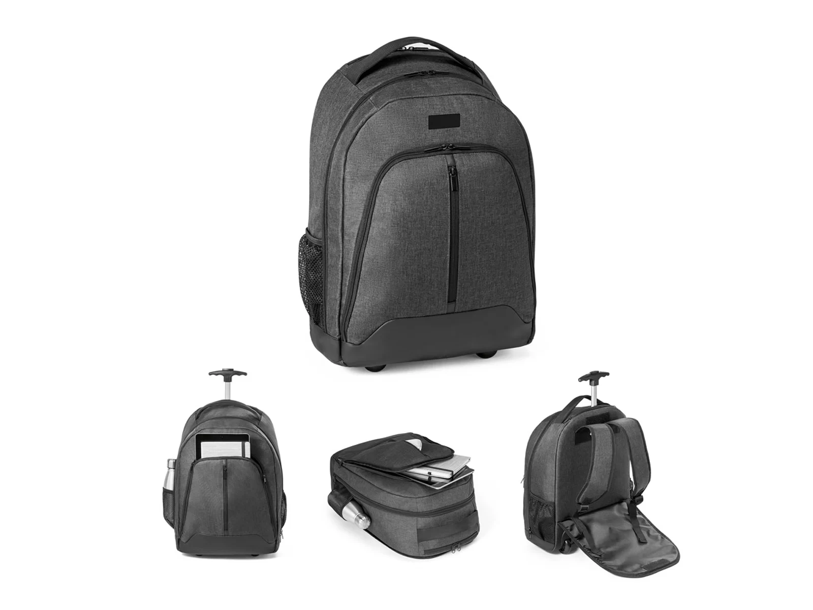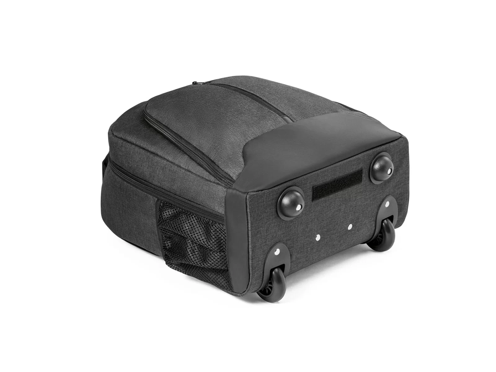 Τρόλευ σακίδιο για φορητό υπολογιστή σε υψηλή πυκνότητα 600D και αδιάβροχο πολυεστέρα 600D. Κύριο διαμέρισμα για φορητό υπολογιστή με οθόνη έως 15,6″. Περιέχει πλαϊνές τσέπες με πλέγμα και μπροστινή τσέπη με διπλό φερμουάρ. Προστατευτικά τροχών και μεταλλική λαβή με δυνατότητα επέκτασης. Η πλάτη και οι λαβές είναι επενδεδυμένες.