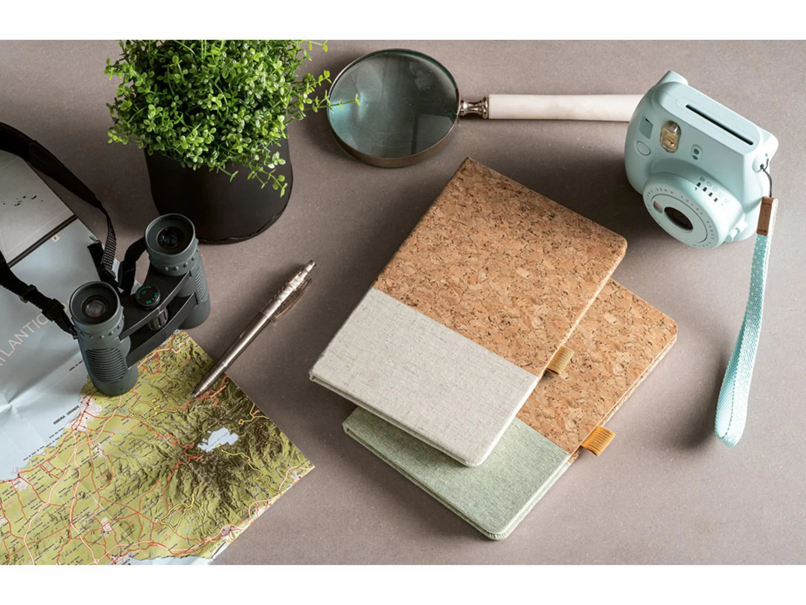 Σημειωματάριο Α5 με εξώφυλλο φελλού και λινό στο κάτω μέρος του. Αυτό το σημειωματάριο διαθέτει 192 ριγέ σελίδες χρώματος ιβουαρ, από βιώσιμη διαχείριση δασών και στήριγμα για στυλό (δεν περιλαμβάνεται το στυλό). Παρέχεται σε φάκελο από χαρτί kraft με αυτοκόλλητο.